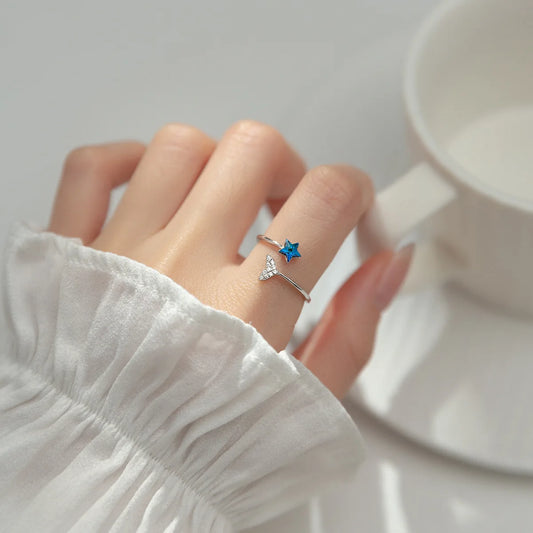Anel Regulável Cauda Cravejada e Estrela do Mar Azul - Prata 925