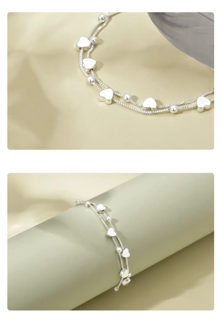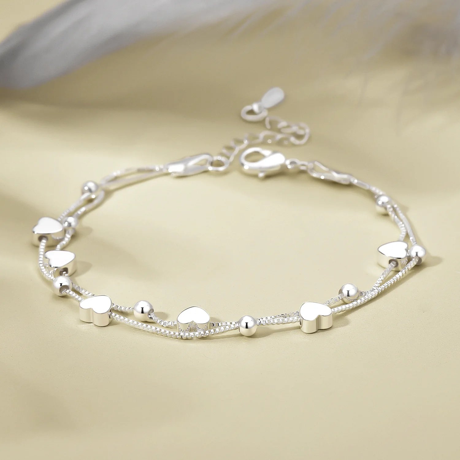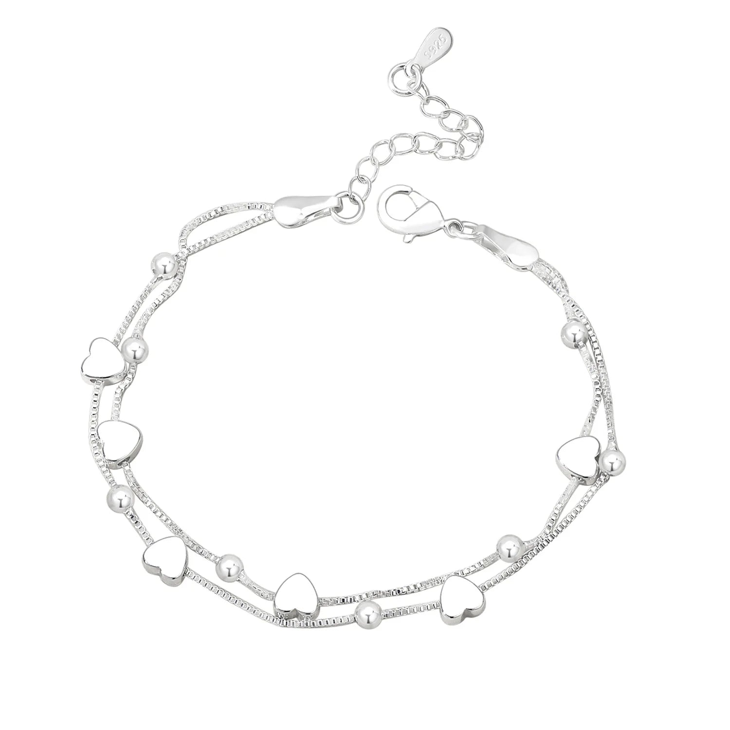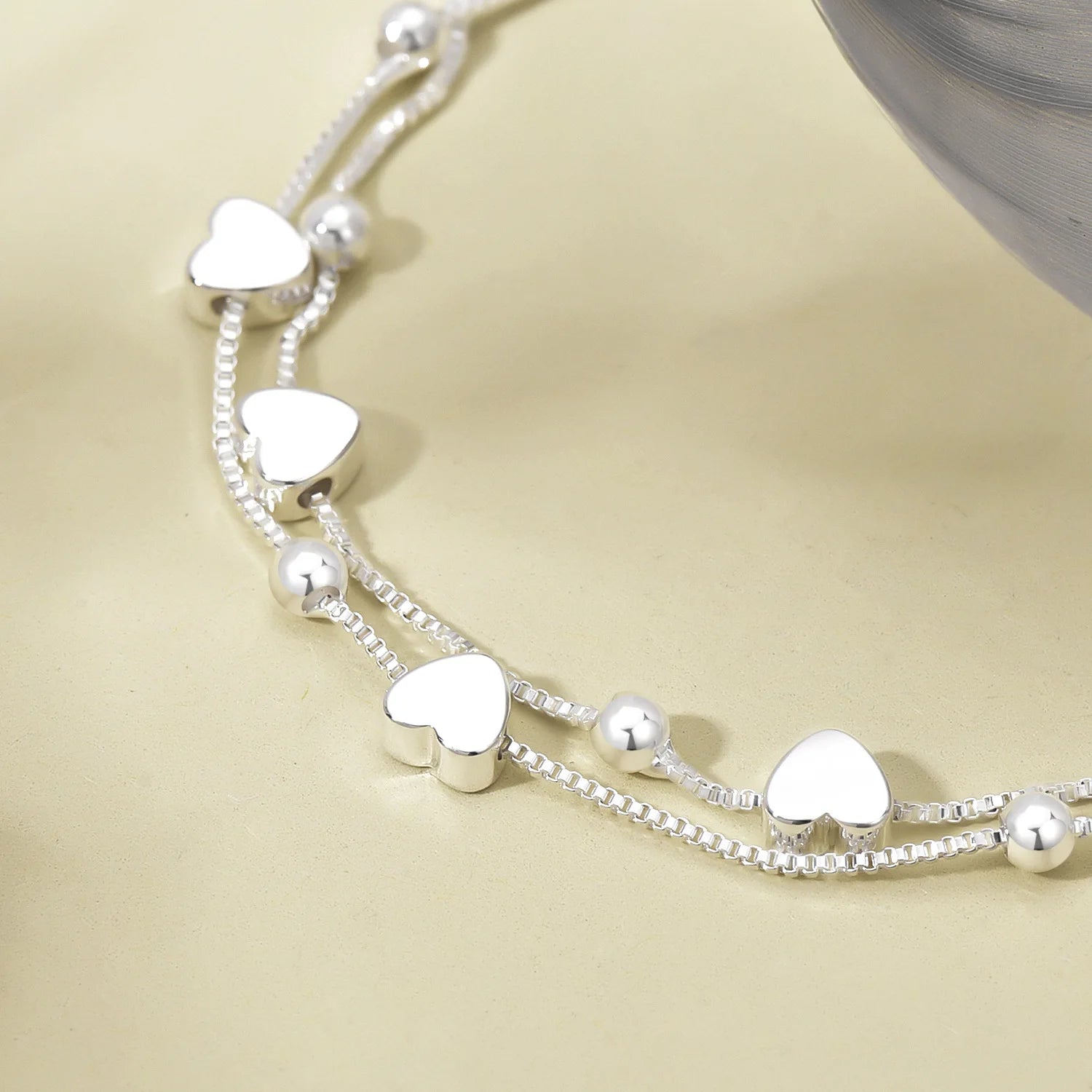 Pulseira Dupla com Bolinhas e Corações lisos - Prata 925