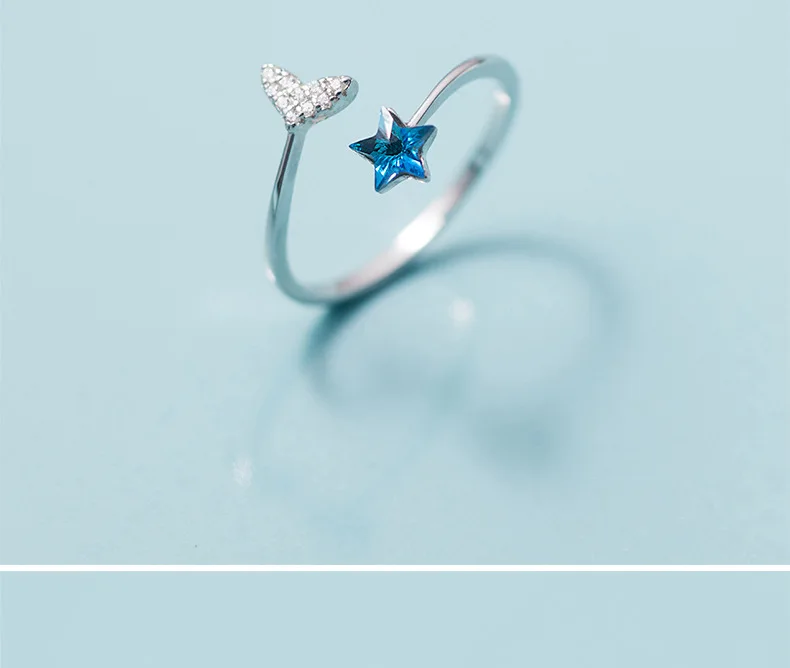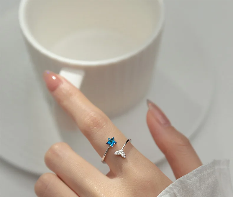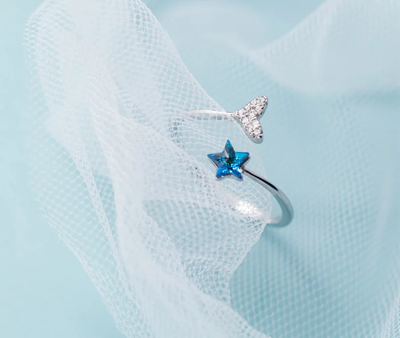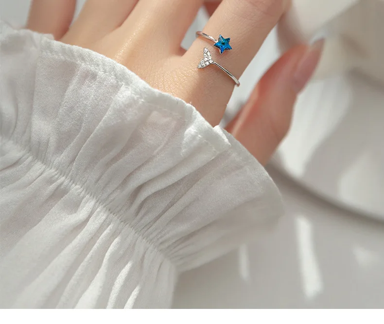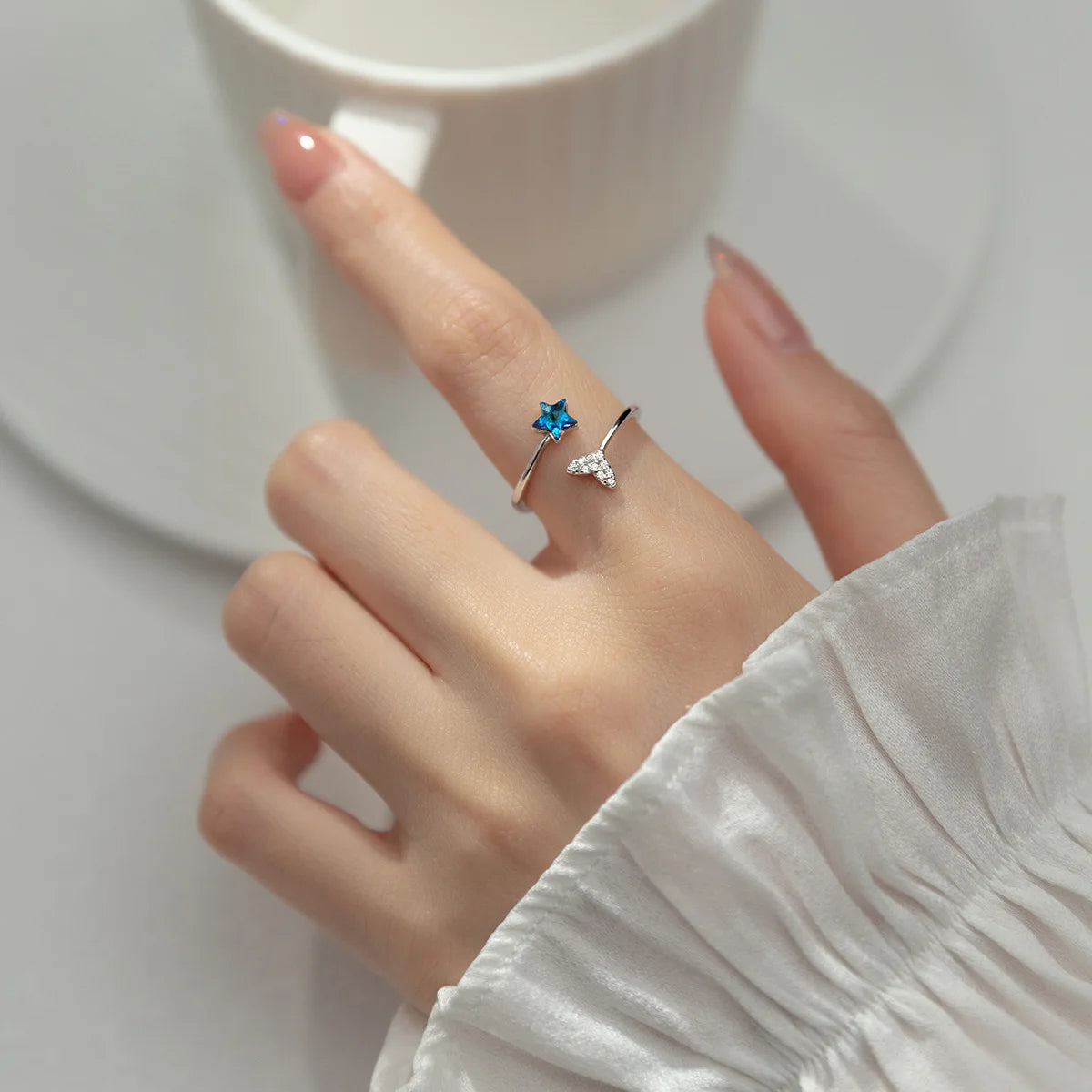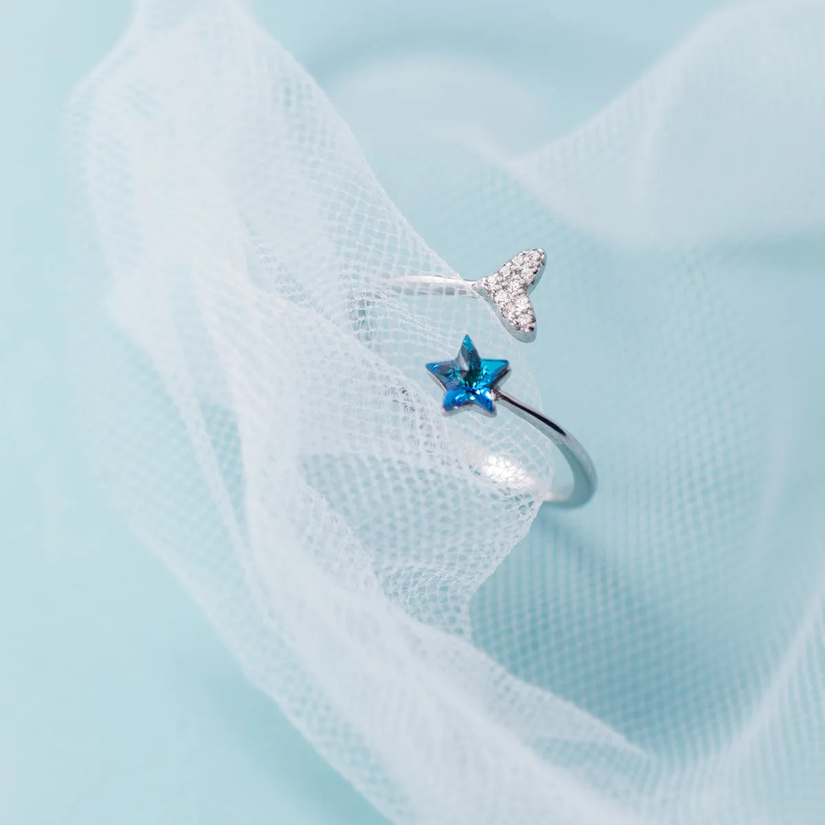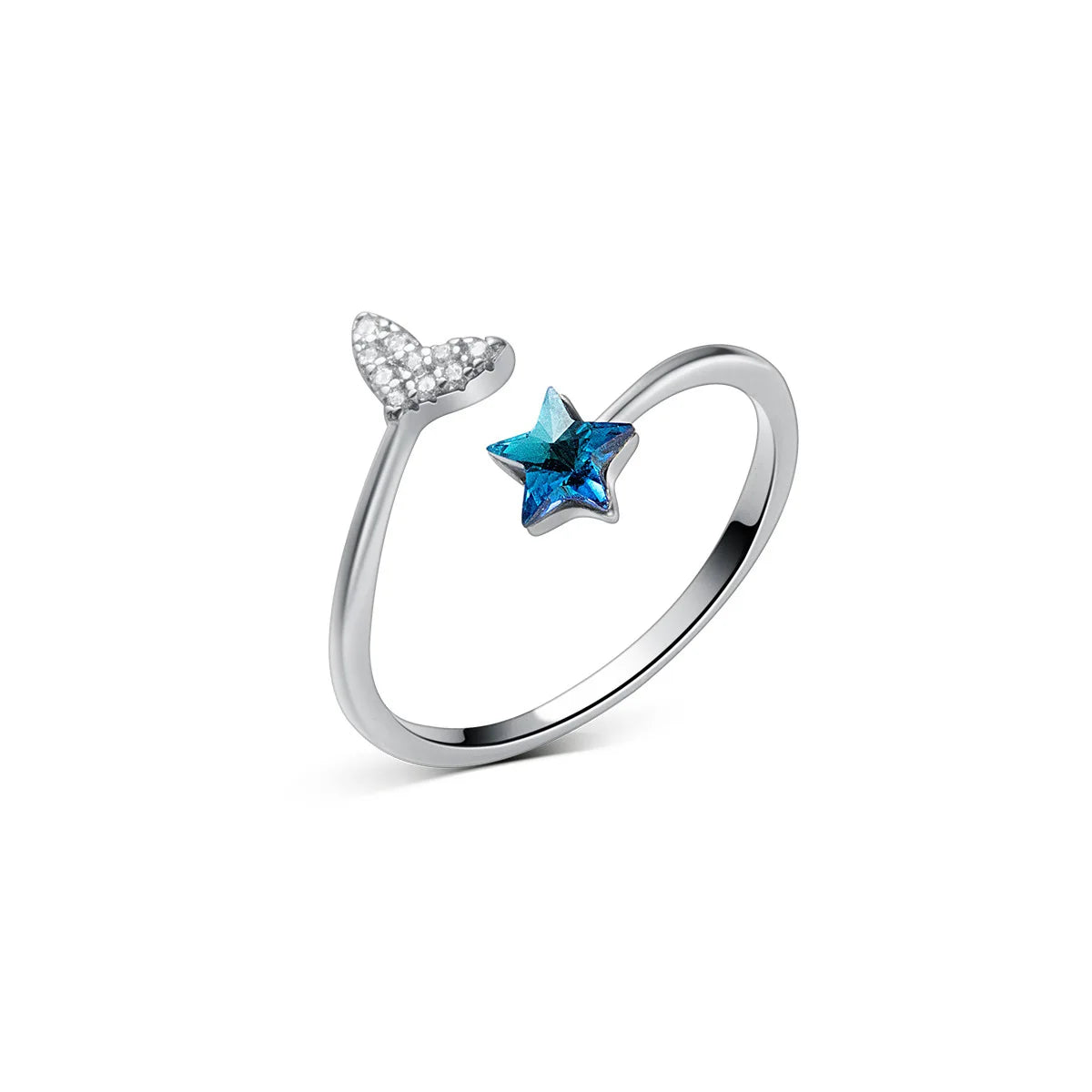 Anel Regulável Cauda Cravejada e Estrela do Mar Azul - Prata 925